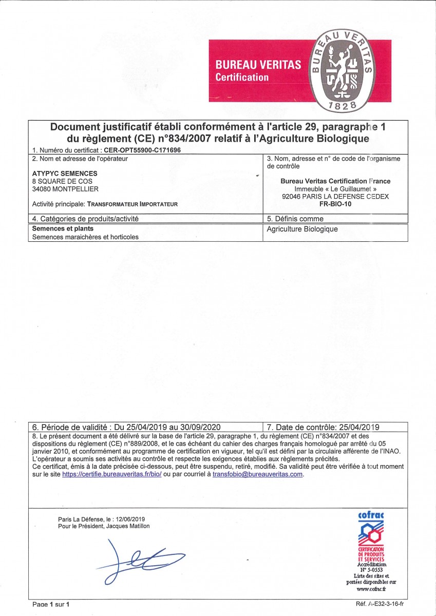 Toutes les graines que nous vous proposons sur tarpin-chavet.fr sont certifiées "Agriculture Biologique" (excepté l'Ail des Ours qui est une semence sauvage)